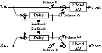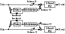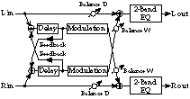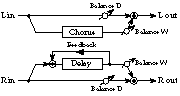 This effect connects a chorus and a delay in parallel. The parameters are the same as for "35: CHORUS ' DELAY." However, the Delay Balance parameter adjusts the volume balance between the direct sound and the delay sound.