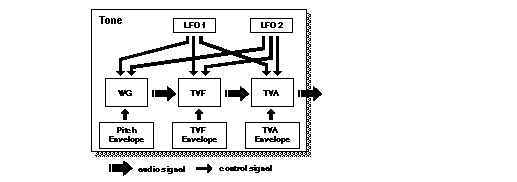 In the JV-1010, the Tone is the smallest class of sound. Each Tone consists of one sound. But when you play the JV-1010 you will mostly play a Patch, which is made up of several Tones. Tones therefore are the elements which collectively form a Patch.