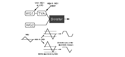 LFO (Low Frequency Oscillator)Use the LFO to create cyclic changes (modulation) in a sound. The JV-1010 has two LFOs. Either one or both can be applied to effect the WG (pitch), TVF (filter) and/or TVA (volume). To illustrate this control's action, you can apply an LFO to modify the WG (pitch) to create vibrato. If the LFO is used to modify the TVA (volume), you'll get tremolo.