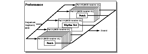 The next level in sound configuration. A single Performance groups 15 Patches and one Rhythm Set so that they can be combined to play ensembles or produce fabulously rich, thick sounds. One Performance allows a single JV-1010 to control up to 16 instrument sounds. Because the JV-1010 sound source can control multiple sounds (instruments) it is called a 'multitimbral sound source.'