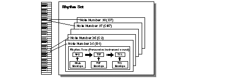 A Rhythm Set is a grouping of percussion instruments (Rhythm Tones). Since percussion instruments generally do not play melodies, there is no need for a percussion instrument sound to be able to play a scale on the keyboard. It is however, more important that as many as possible percussion instruments be available to you at the same time. Therefore, each key (Note number) of a Rhythm Set will produce a different percussion instrument.