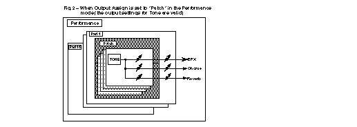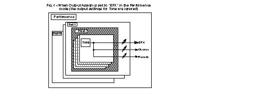 The EFX, Chorus and Reverb effects can be set individually for each Performance and GM mode. The intensity of each effect will be set for each Part (Fig. 1), but the Send Level setting for each Tone can also influence effect intensity (Fig. 2). Effects settings of the Patch assigned to each Part will be ignored, but EFX applied to a Patch assigned to a given Part can also be applied to the entire Performance.